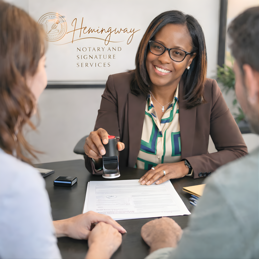 When life’s important moments require a trusted notary and qualified witness, Premier Tax Advisors, through Hemingway Notary & Signature Services, delivers professional, dependable, and convenient notary and signature solutions. As a Florida-licensed, insured Notary Public and Certified Remote Online Notary (RON), we are NNA background screened and committed to handling your documents with accuracy, confidentiality, and full compliance with Florida law—whether online, in person, or through mobile notary services.